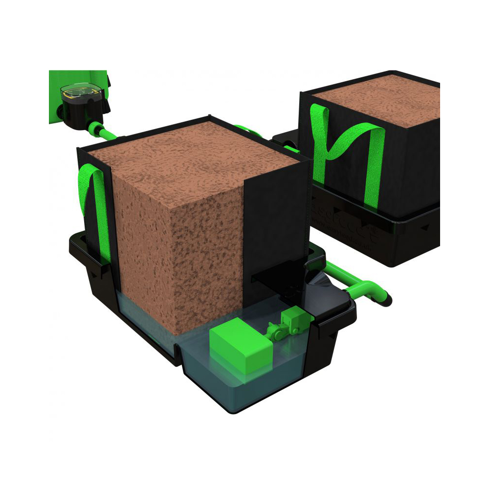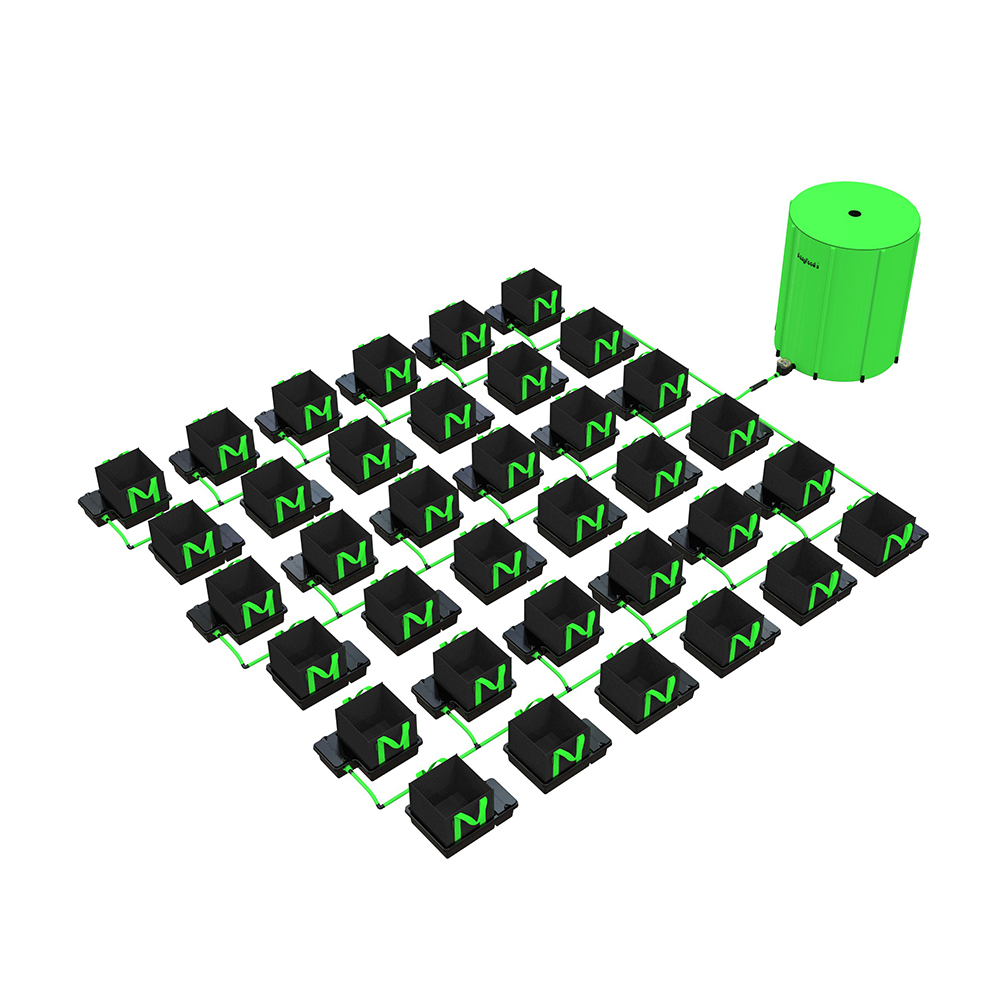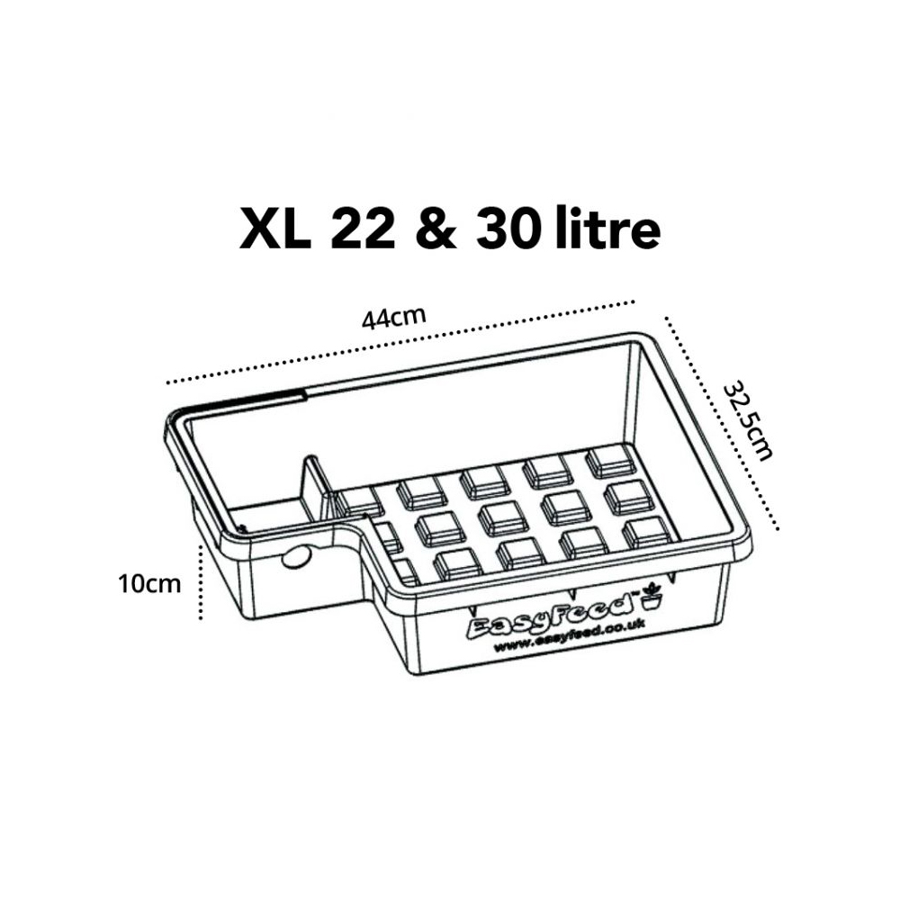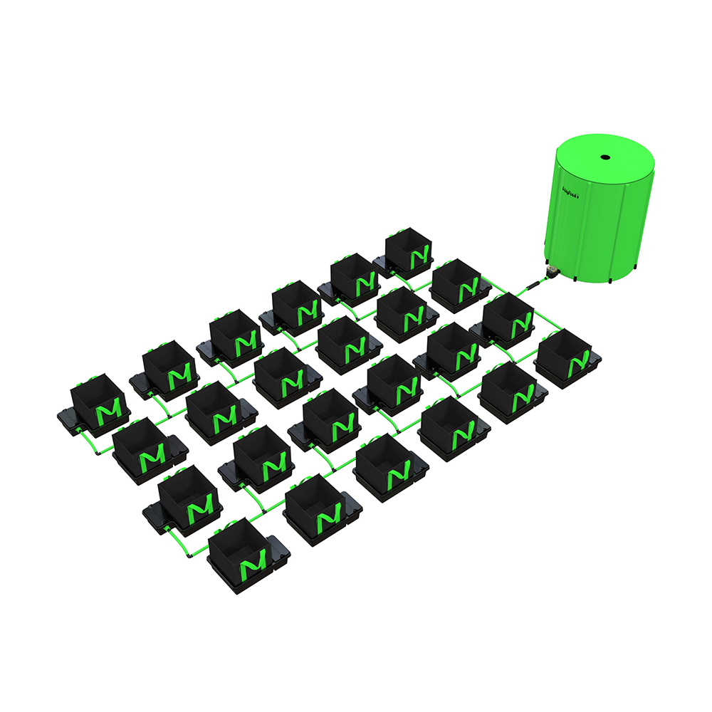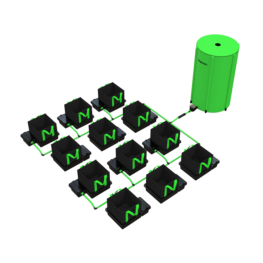 Why go to the trouble of hand-watering when you can let the EasyFeed System take care of it for you? The team at Alien Hydroponics, who created the EasyFeed, have noted the criticisms of other gravity-fed systems and developed a low-maintenance set-up that ticks all of the boxes. It provides the simplicity and ease of use of an Autopot or GoGro, combined with the growth rates and programmability of more complex systems, like the IWS Flood & Drain.Fine-Tune Your Feeding Routine with the EasyFeed Water TimerOther gravity-fed systems work using float-valves that refill trays with nutrient every time they run dry. This method of working may be more convenient than handwatering, but it has a big drawback, in that the grower loses control of the watering schedule. Dry periods can be as important as waterings, because these periods allow the rootzone to re-oxygenate. Rootzones that stay sodden for too long will slow down growth and are more vulnerable to diseases like pythium, which can ruin entire crops. With this system, you can choose your feeding times and durations using the innovative, battery powered EasyFeed timer. This will regulate the flow of nutrient from the tank, so that feeding occurs on a schedule that suits you, whether it be hourly, daily, every 2 to 3 days, or even on a weekly basis. You can also choose the duration – from one minute long to two hours long, if necessary. With the EasyFeed system, you maintain full control of your indoor garden.Superior Quality ComponentsThe EasyFeed comes with 13mm (internal) / 16mm (external) pipe, which allows nutrient solution to flow freely through the system. Thicker pipework reduces the likelihood of encountering a blockage, keeping your system running sweetly. The trays are moulded from tough plastic that’s highly resistant to cracking, helping to prevent damage and leakages in the event of an accident.The height level of the nutrient solution inside each tray can be altered by adjusting the float valves. This means that you can feed different sized plants at the same time without causing any issuesNutrients are held in a premium-grade Flexi Tank. Flexi Tanks are collapsible, making them much easier to transport and store. They can be used in places where solid tanks just won’t fit – through doorframes and up loft hatches, for instance. They’re an incredibly practical solution that’s been tested to death. We’ve sold thousands of them over the years and we’re yet to hear of one ever letting anybody down.Fabric PotsOther gravity-fed systems come with old fashioned solid pots, whereas the EasyFeed system is equipped with fabric pots. Solid pots create lower numbers of longer roots that circle repeatedly around the bottom of containers. Most of the substrate in your containers is often left unoccupied by roots, which is obviously a huge waste. Cloth pots fix this fundamental issue using something called ‘root-pruning’.In root-pruning containers, roots grow towards the outer edges of the substrate until they hit the fabric sidewalls. At this point, the fresh air causes the end of the root to die off, and a new one is sent out from the centre of the root-zone. This triggers the development of a dense, radially structured mass of roots that fills every bit of space within the container. Breathable fabric also comes with other great benefits: it increases the level of oxygen around the rootzone, which accelerates the whole process detailed above, while allowing heat to dissipate more freely, keeping rootzone temps in the sweet spot. Stronger roots equal stronger plants. And stronger plants mean BIGGER YIELDS and a better quality end-product.The fabric pots used are extremely high-quality and come with handles, so that you can turn your plants without disturbing root hairs and causing stress. Turning plants regularly will help to ensure that light reaches all sides, for even growth and better developed fruits. These pots naturally seal the substrate inside the container, whereas regular pots have holes in their undersides that can often allow bits of soil or coco to fall out. Fabric pots keep your grow room cleaner and tidier while preventing blockages.Fabric Pot Sizes:10 litre: 22cm x 22cm x 22cm16 litre: 22cm x 22cm x 33cm22 litre: 28cm x 28cm x 28cm30 litre: 28cm x 28cm x 38cmTray Sizes:Standard (suits 10 & 16 litre pots): 38cm x 26.5cm x 9cmXL (suits 22 & 30 litre pots): 44cm x 32.5cm x 10cm