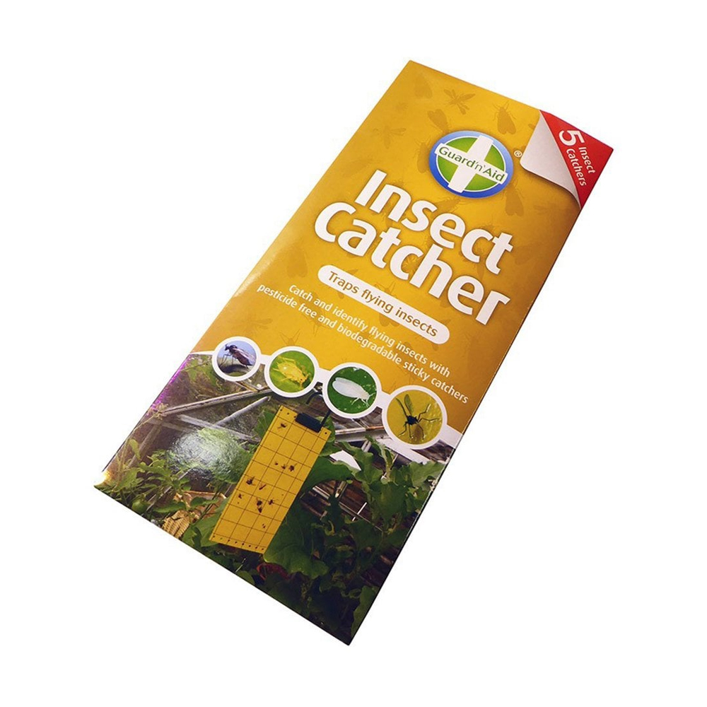 Five double sided insect catchers with hanging hooks. Guard N Aid insect catchers are your first line of defence in identifying if you have a flying pest problem in your greenhouse or conservatory. Insects are attracted to the Aureola-Yellow light wavelength of the sticky insect catcher and once in contact with the sticky surface, they cannot get away.