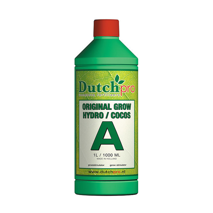 Product InformationComplete grow feed purposely designed for hydro/cocos. This product has all of the essential macro- and micro growth nutrients necessary that is needed for exuberant growth. The high-quality components will completely be absorbed and leave no residue behind.AdvantagesStimulates maximum growthIncreases strength and health throughout the growth phaseEC-levels up to 2,0Suitable for every irrigation systemOptimal absorption by the plantNo residueExtra InformationPlants take up essential elements from the air and light, but also from the nutrients in the soil. The roots and leaves from a plant are the major components to take up these elements. It is essential that plants not only get sufficient nutrients, but also in the appropriate ratio. This to prevent nutrient deficiency or toxicity (when a plant get too much nutrients) and to stimulate maximum growth and health.During the grow phase a plant is at its most vulnerable. Fungi- and bacteria related diseases are a real threat to the underdeveloped roots and leaves. To help a plant develop during the grow phase a right mix of potassium, nitrogen and phospor is needed to support maximum growth rate. This will make and keeps the plant vital and strong throughout the grow phase.Original Grow Hydro/Cocos A+B is a perfectly mixed two component nutrient, that contains potassium, nitrogen and phospor to stimulate maximum growth and prevent diseases. Original Grow Hydro/Cocos A+B is also optimized to reach EC-levels of 1,8 – 2,0 (it is possible to deviate) to get an even better result!